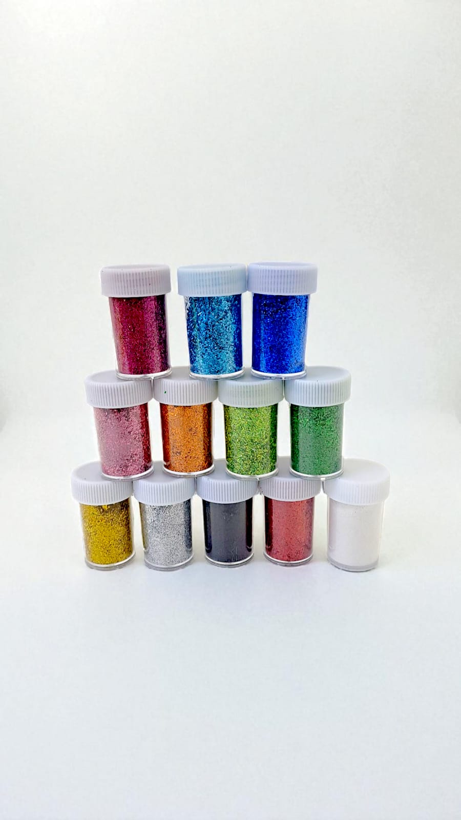 Блёстки для декора представляют собой набор из 12 разноцветных баночек мелких блёсток.