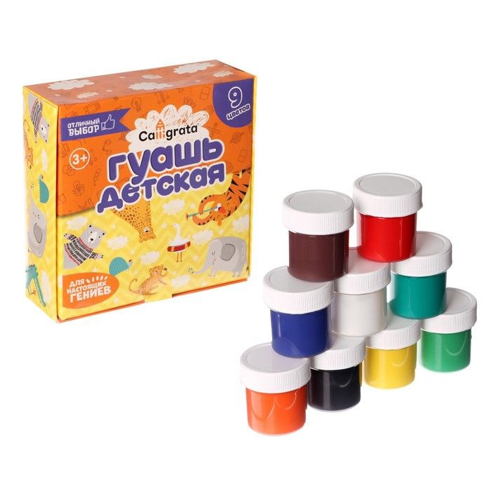 Гуашь для рисования Calgrata серии «Отличный выбор» предназначена для творческих занятий в школе и дома. Краска производится на основе качественного прозрачного связующего вещества, обеспечивающего чистоту цвета. Плотная, укрывистая текстура красок хорошо смешивается, равномерно наносится практически на любую основу. При высыхании дает бархатистый матовый эффект. Безопасны для детей, нетоксичны. В наборе 9 баночек разных цветов. Объем каждой баночки -20 мл. Цветовая палитра гуаши Calgrata состоит из классических оттенков. Страна бренда: Россия; Страна производства: Россия; Артикул производителя: 4777634; Производитель: Calligrata; Объем баночки: 20; Количество в наборе: 9;