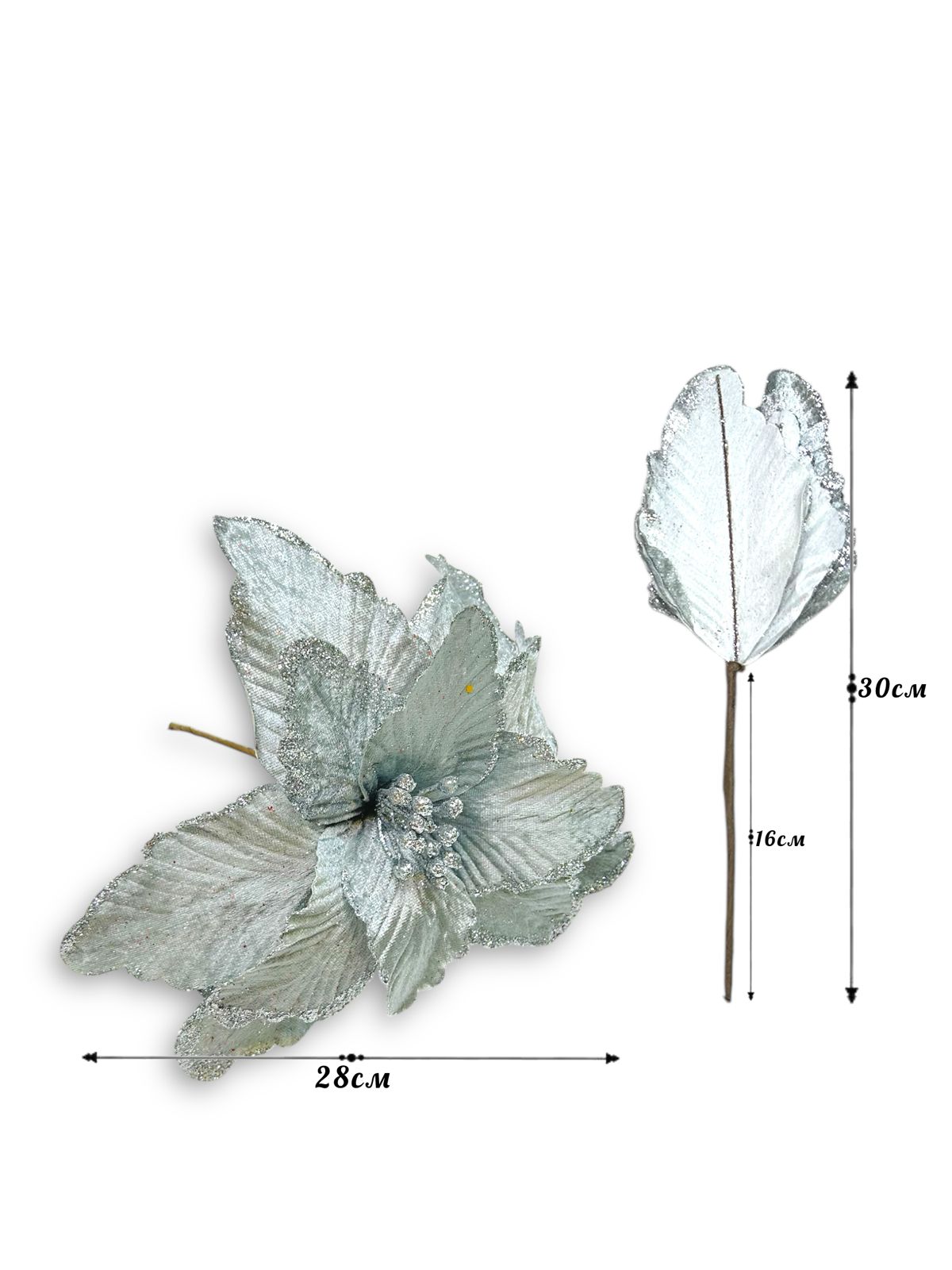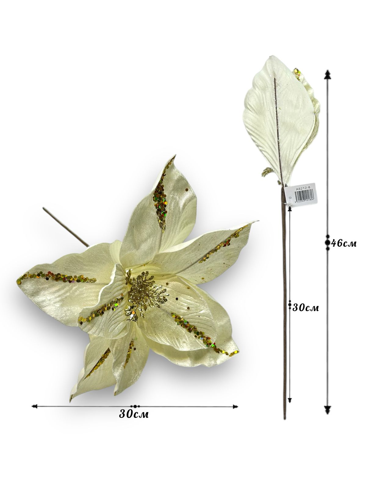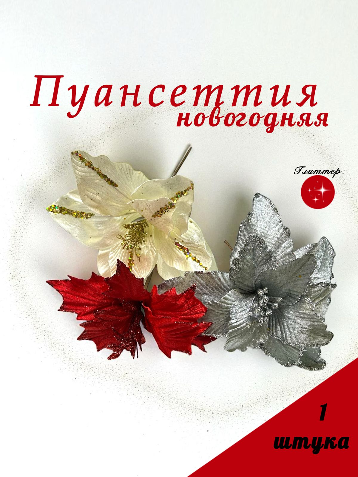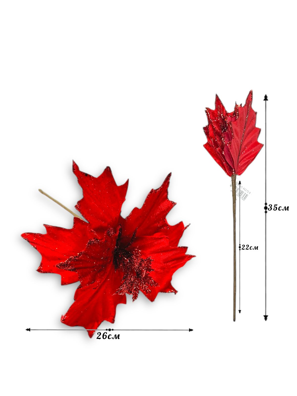 Пышный остролистный цветок с мерцающими блестками, добавит новогоднему декору яркости и красочности.