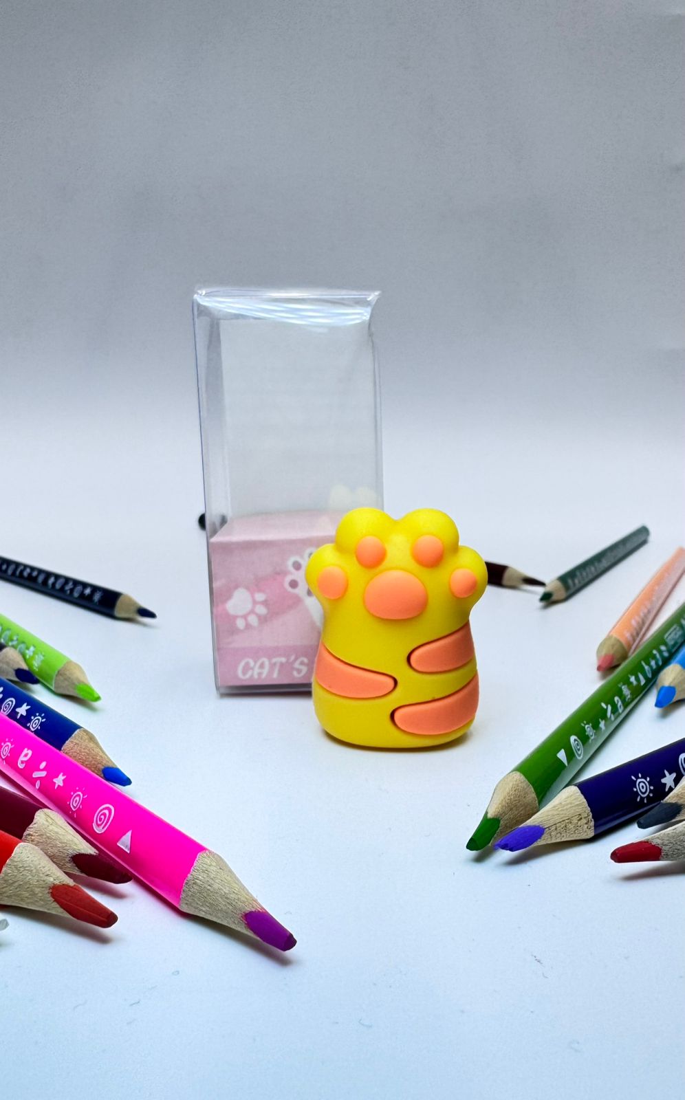 Имеет форму желтой кошачьей лапки с оранжевыми подушечками и полосками, что делает ее привлекательной для детей и любителей животных.