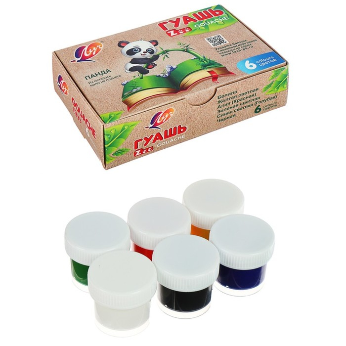 Набор гуаши ЛУЧ серии ZOO из 6 цветов: желтый светлый, зеленый, белила, алый, синий темный, черный.