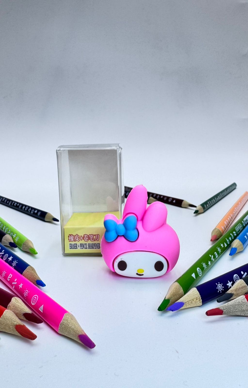Ластик-точилка выполнена в форме головы My Melody, розового кролика с бантом.
