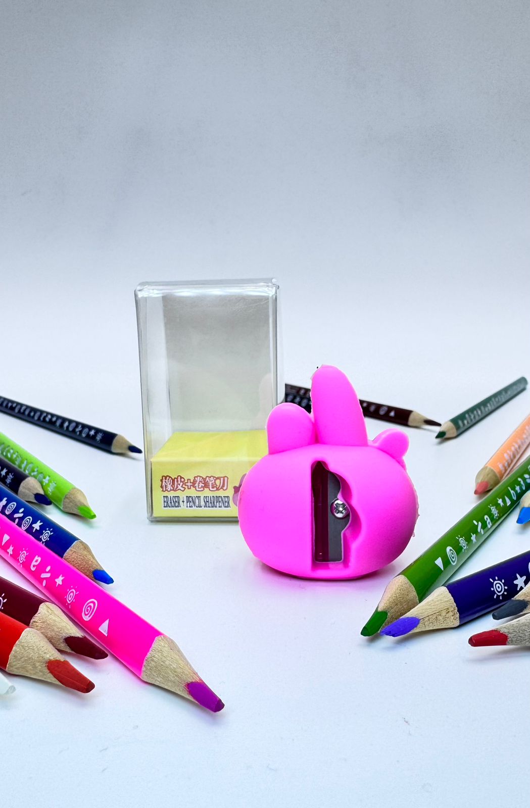 Продукт представляет собой комбинацию ластика и точилки для карандашей, о чем свидетельствует надпись на упаковке «ERASER + PENCIL SHARPENER».