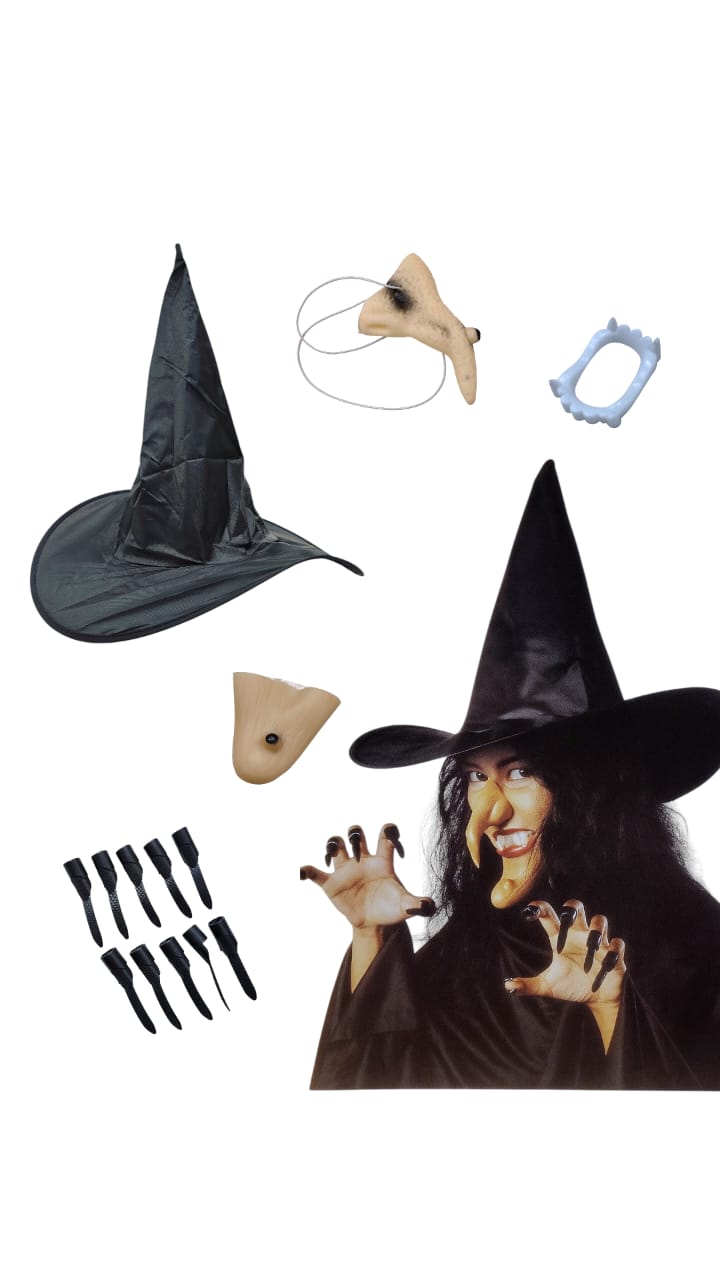 В комплект входят колпак ведьмы, а также нос зубы челюсть когти который позволит вам создать уникальный образ. Материалы, из которых сделаны аксессуары, обеспечивают комфорт и долговечность.