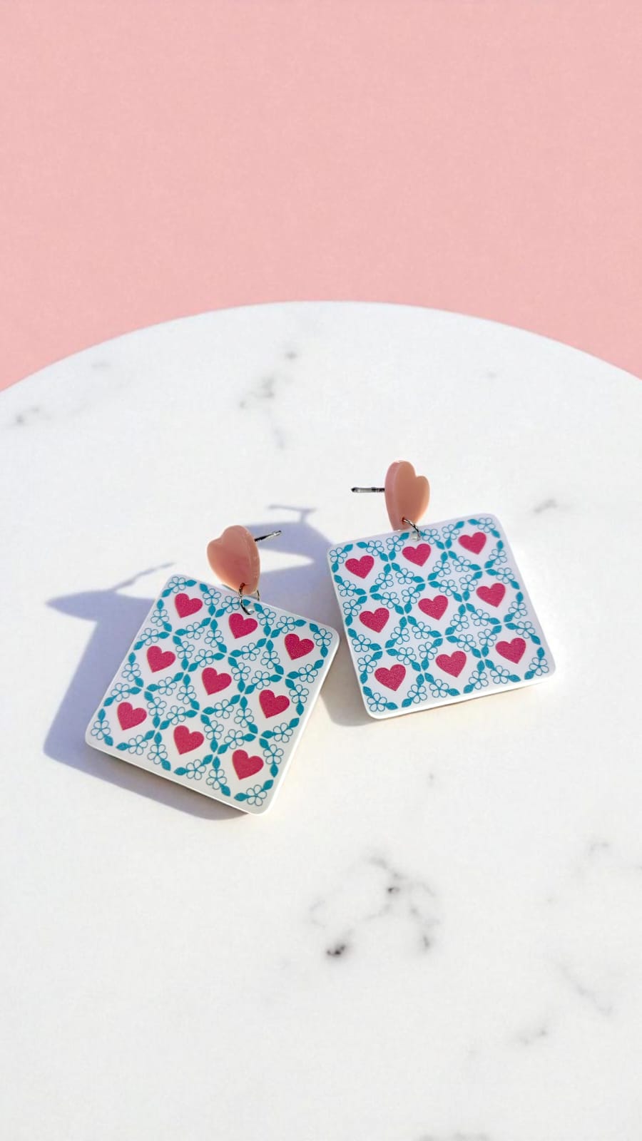 Серьги квадратные с сердцем арт.tr2083 бело-бирюзовые