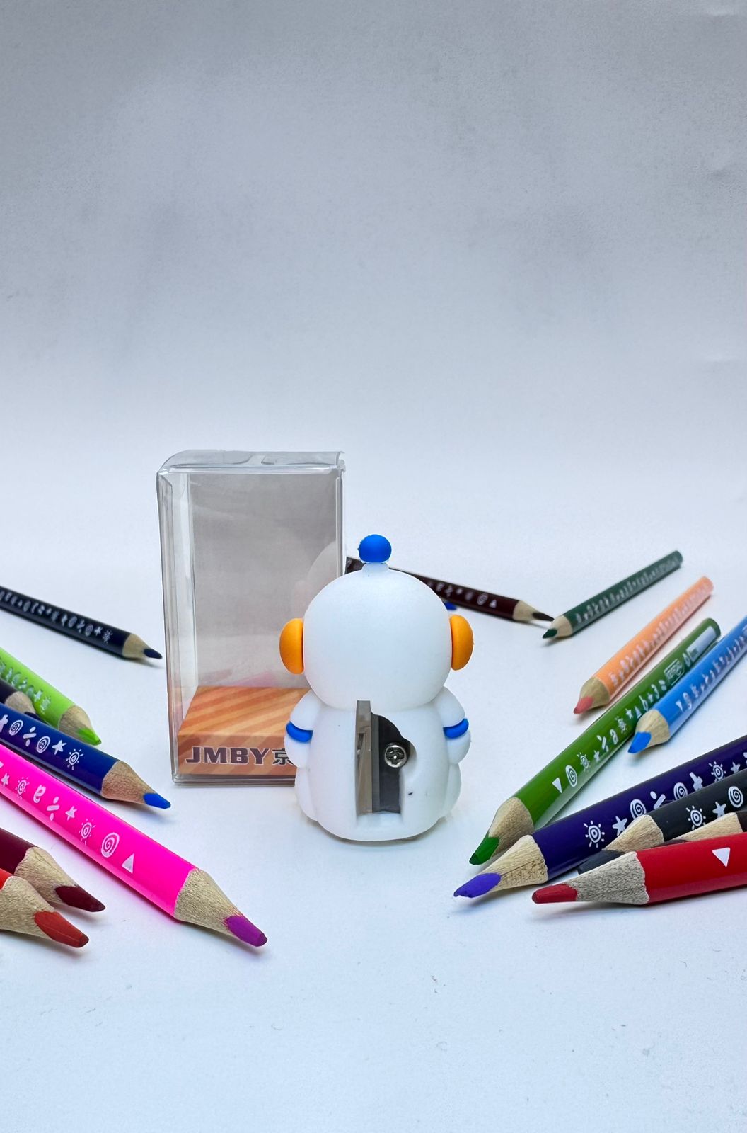 На «лицевой» части робота расположен дисплей, отображающий пиксельные изображения в форме сердец, что придает ему милый и дружелюбный вид. В центре «головы» находится отверстие для затачивания карандашей.