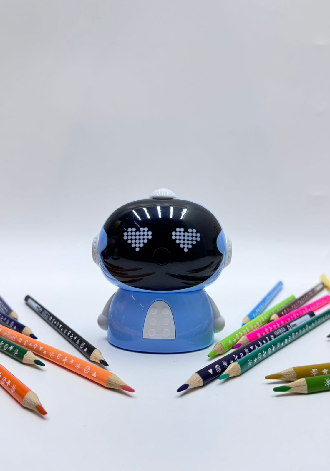 На «лицевой» части робота расположен дисплей, отображающий пиксельные изображения в форме сердец, что придает ему милый и дружелюбный вид. В центре «головы» находится отверстие для затачивания карандашей.