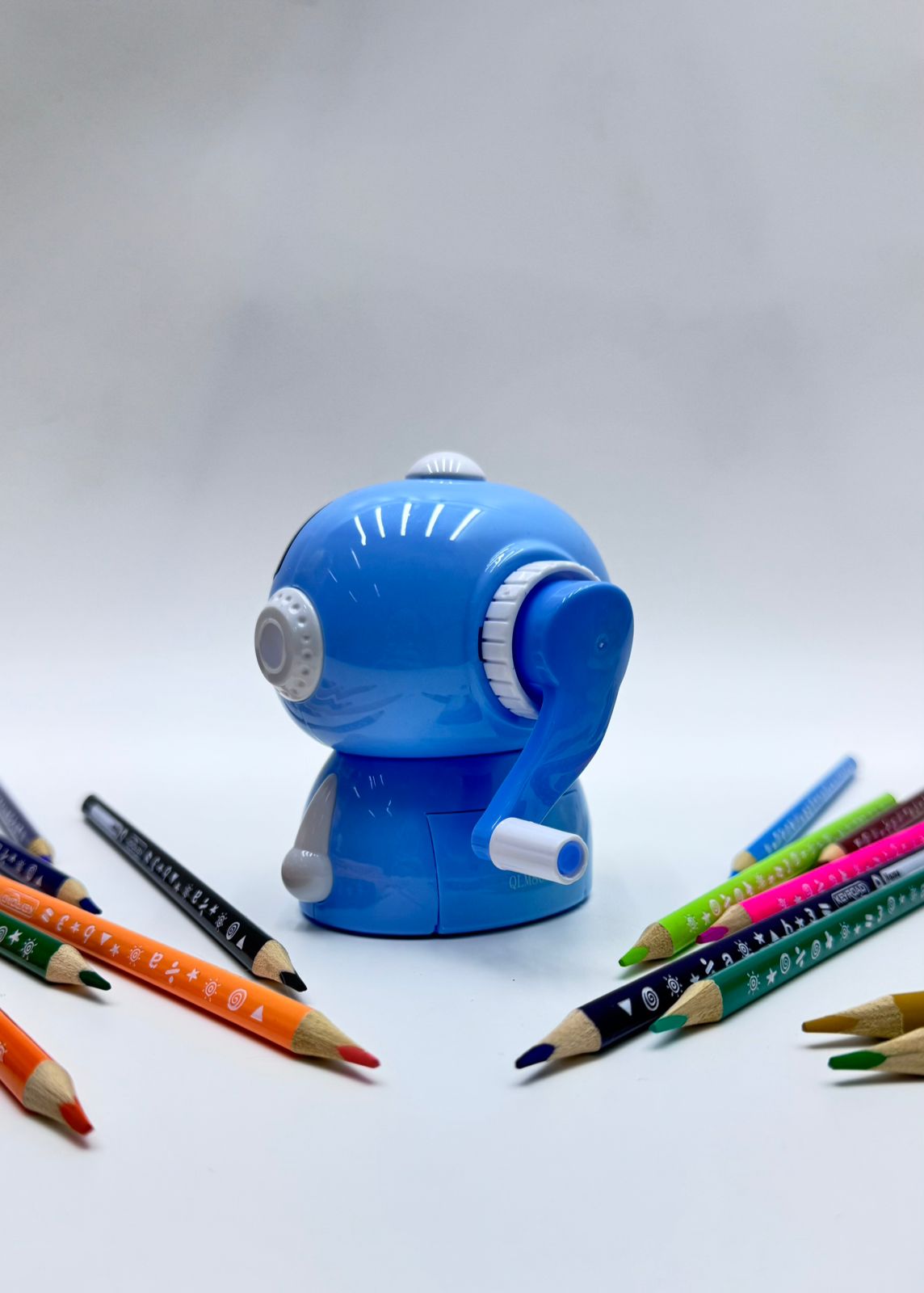 Точилка имеет округлый корпус голубого цвета с черной «головой» и белыми элементами, напоминающими наушники.