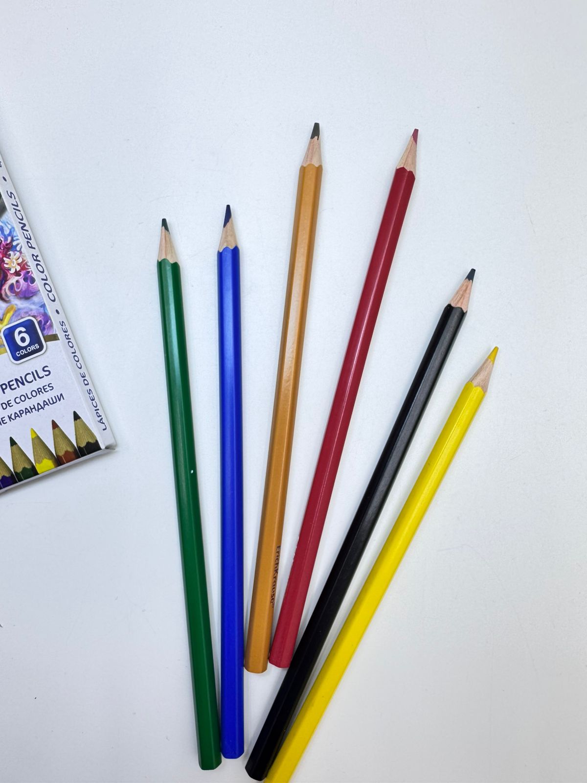 Включают 6 цветов и поставляются с точилкой внутри упаковки.